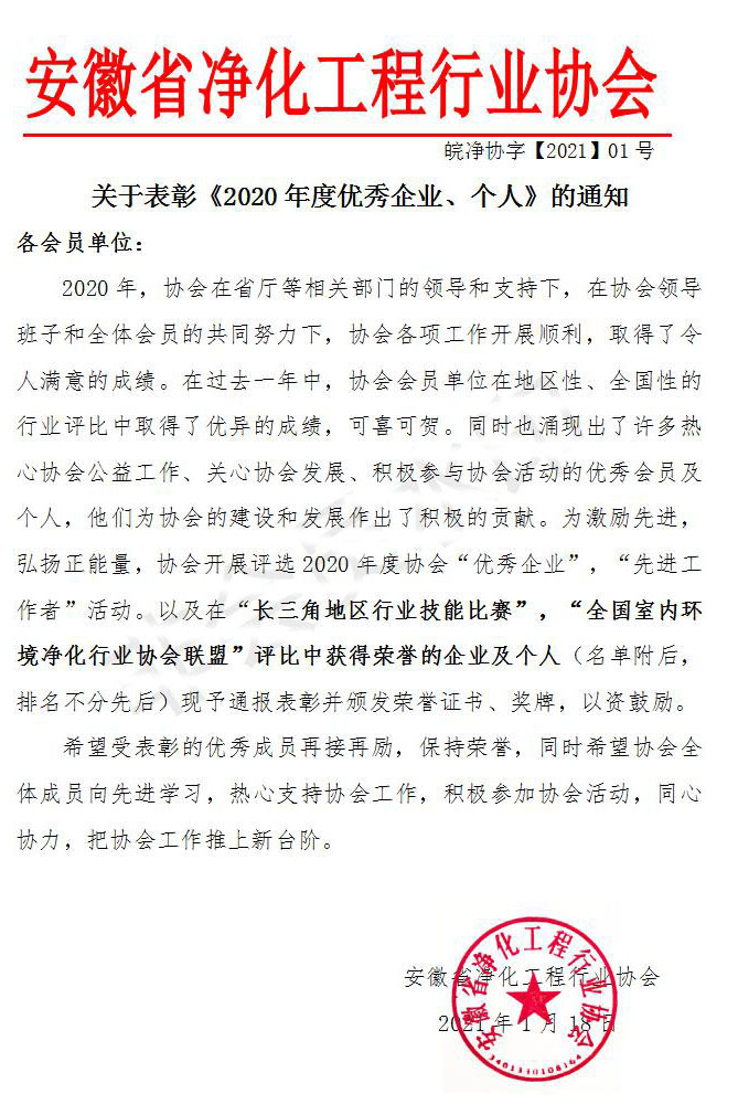 关于表彰《2020年度优秀企业、个人》的通知